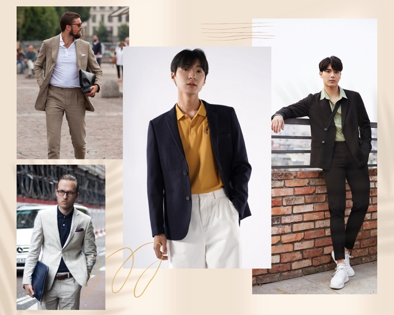 Đây là sự kết hợp mang đậm chất phương tây. Một chiếc áo polo có cổ cùng với áo blazer nam giúp tôn lên vẻ mạnh mẽ và lịch lãm hơn cho các chàng trai.