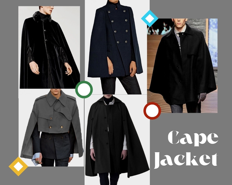 Cape Jacket mẫu áo này có nguồn gốc từ Pháp. Trước đây chúng giống như mẫu khăn choàng bản lớn, dành cho tầng lớp quý tộc ở Phương Tây. Về sau được cải tiến và biến đổi thành kiểu khoác không tay hoặc phần tay áo và cầu vai biến tấu, thiết kế cũng được mở rộng hơn như cánh rơi.
