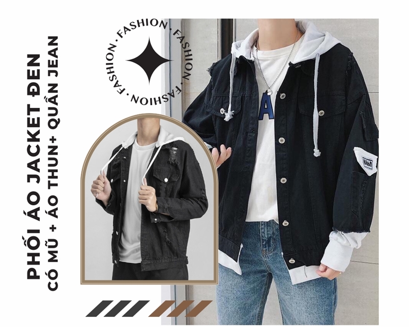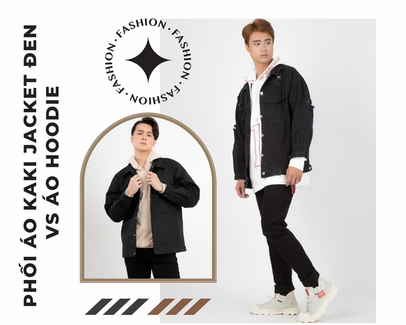 Phối áo Jacket Kaki nam màu đen với áo hoodie và quần jeans