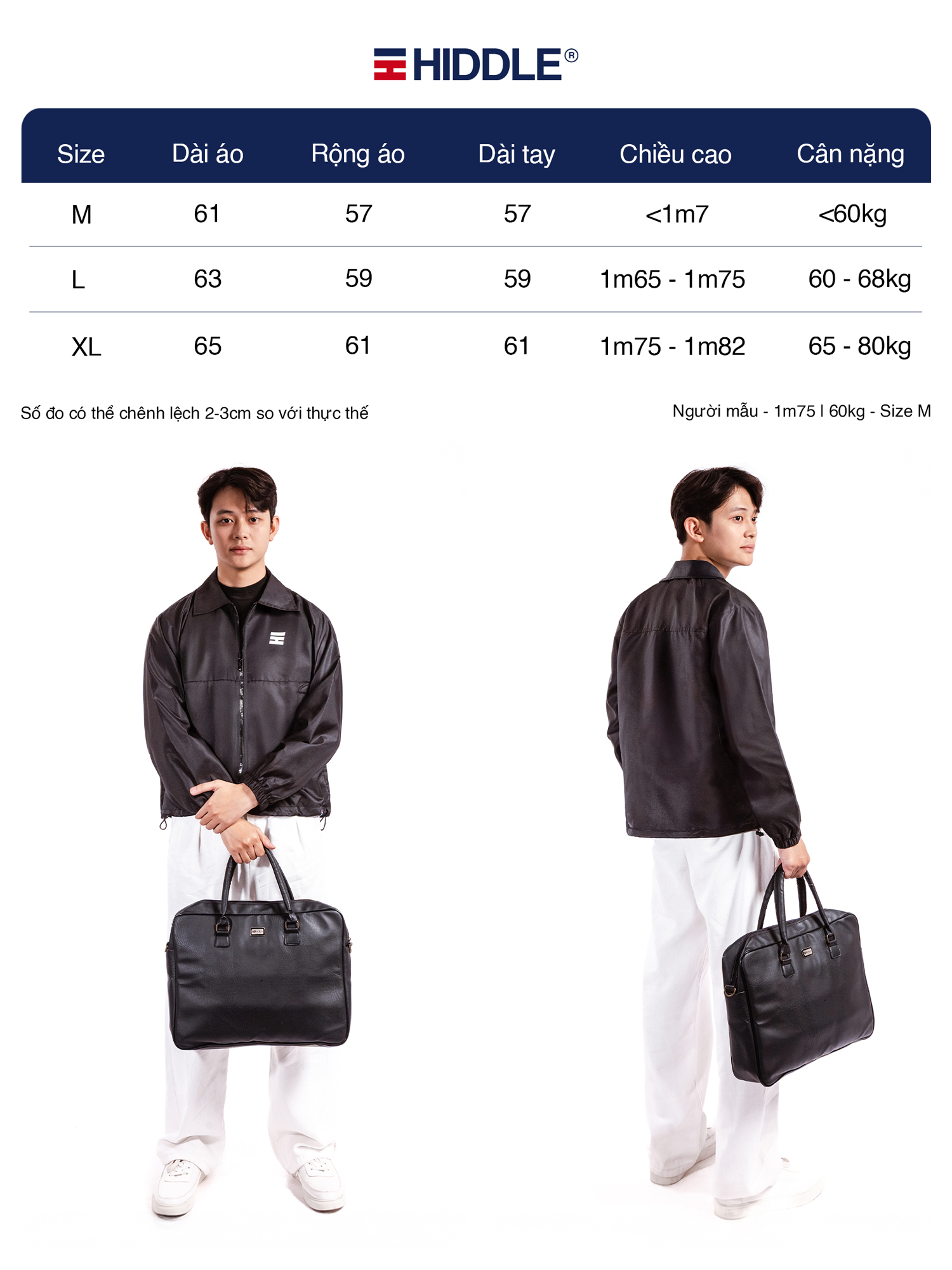 Size M áo khoác gió nam chính hãng Hiddle có: Chiều dài áo 68cm, chiều rộng 59cm, độ dài tay áo 60cm, ngang vai 50cm.