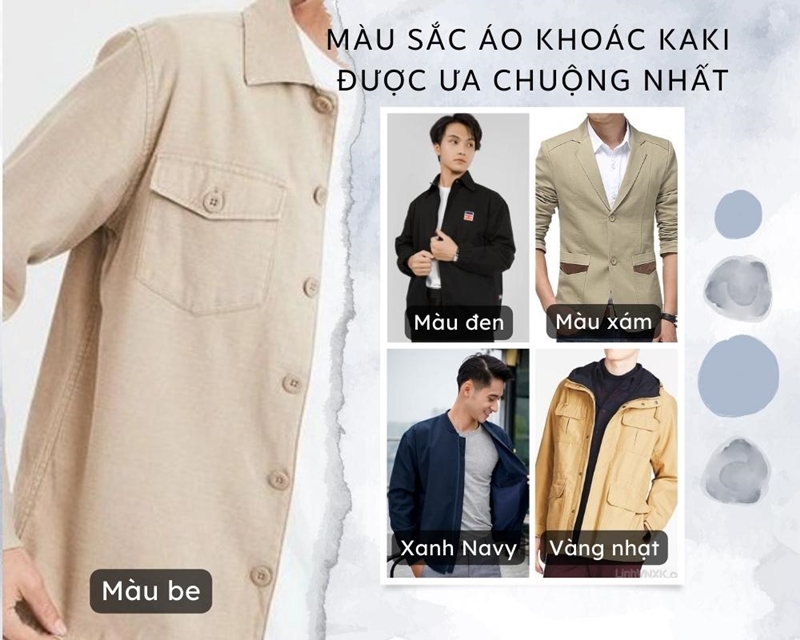 Áo khoác kaki nam là một trong những loại áo khoác phổ biến và được yêu thích bởi nhiều nam giới bởi có sự đa dạng về kiểu dáng và màu sắc. Màu sắc của áo khoác kaki nam thường rất đa dạng, bao gồm: