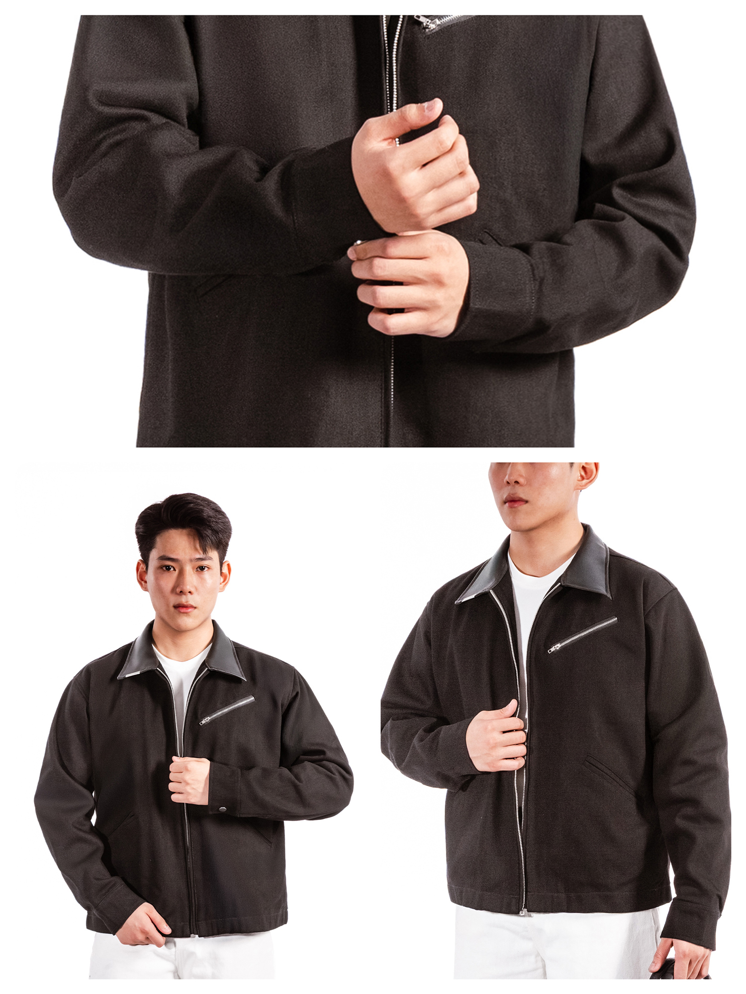 Cổ bẻ phối da: tăng tính thời trang, có thể dựng lên hoặc gập xuống linh hoạt.