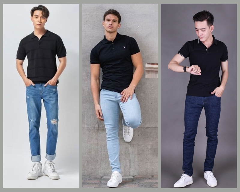 Quần Jean xanh Basic phối với áo polo đen cùng giày sneaker màu trắng