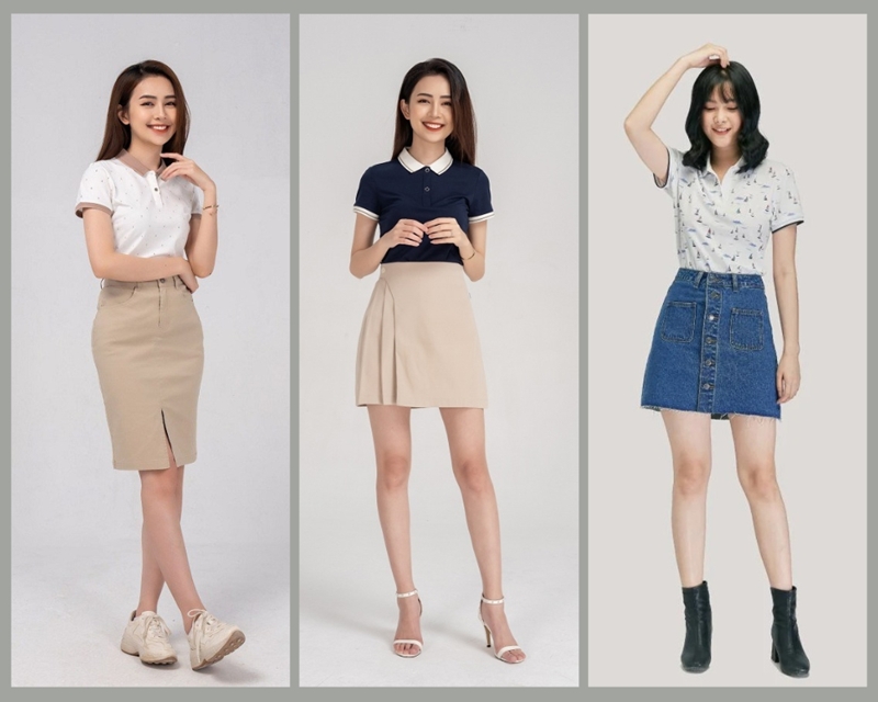 Bạn là cô gái trẻ năng động muốn tìm kiếm cho mình cách phối đồ với áo polo sao cho trưởng thành, thanh lịch nhưng không muốn đánh mất đi sự trẻ trung vốn có của lứa tuổi? Thì đây chính là phong cách sinh ra đã dành cho bạn, rất được các tín đồ thời trang nữ ưa chuộng nhất là giới trẻ Châu Á. Với outfit này, bạn nên lựa chọn cho mình những chiếc áo Polo có màu đơn sắc phối cùng với chiếc chân váy jean hoặc kaki có độ dài trên gối sẽ tạo hiệu ứng giúp đôi chân dài ra.