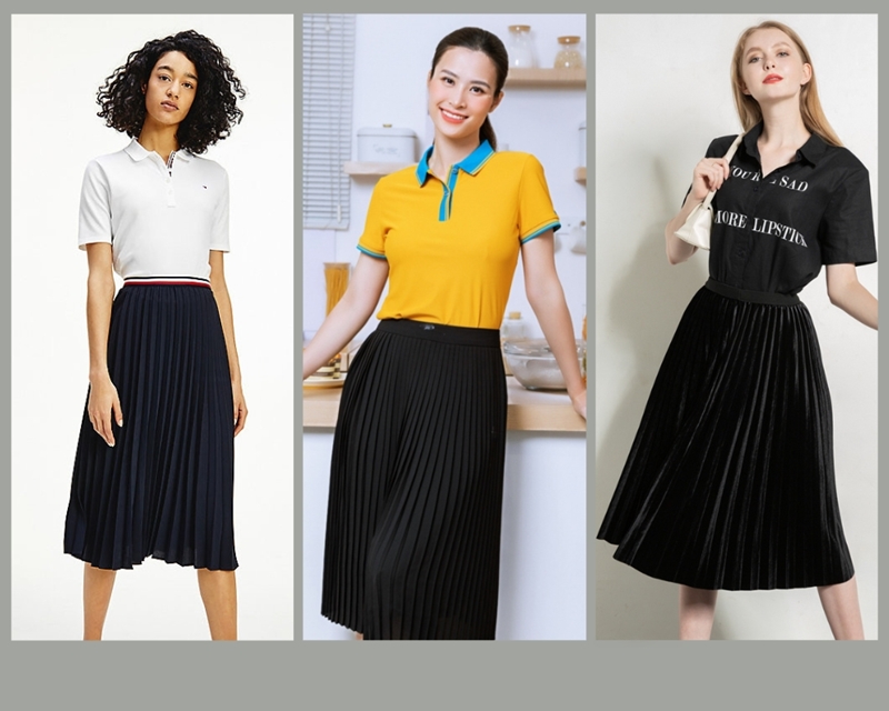 Áo Polo đại diện cho phong cách năng động, chân váy xếp ly dài đại diện cho phong cách nữ tính. Khi kết hợp 2 outfit này lại với nhau đảm bảo các nàng sẽ bất ngờ và không phải thất vọng. Bởi sự thanh lịch và thoải mái của outfit này mang lại. Đây là sự lựa chọn hoàn hảo nhất cho những cô nàng văn phòng yêu thích sự nữ tính. Với set đồ này bạn chỉ cần phối cùng chiếc kính râm và 1 đôi giày sục hoặc sandal cột dây sẽ tạo điểm nhấn vừa đằm thắm vừa nhẹ nhàng. Đảm bảo các chàng trai sẽ đổ gục khi các nàng diện outfit này xuống phố.