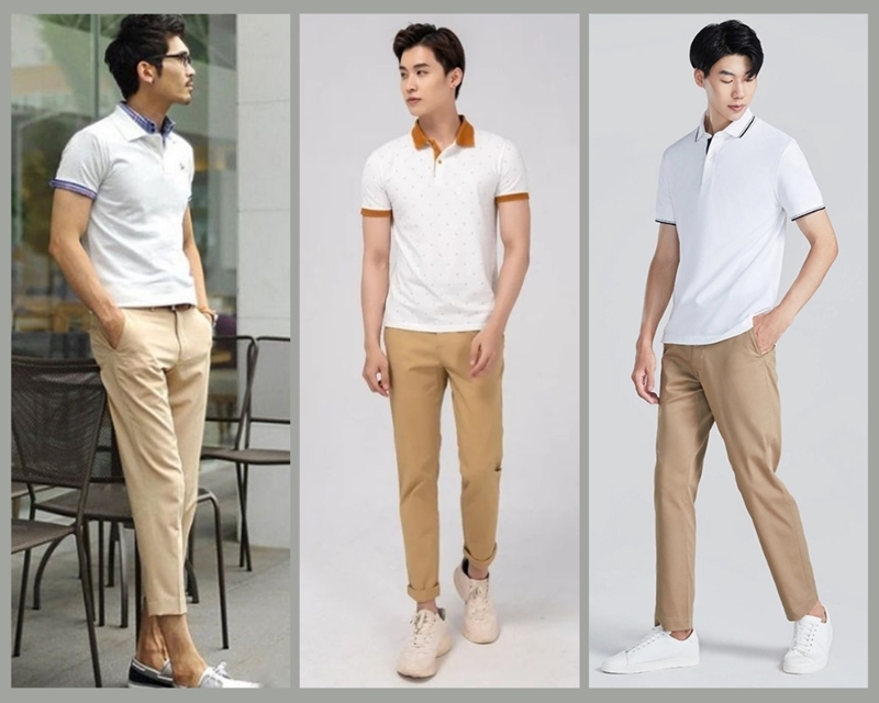 Đối với áo polo nam tông Trắng, nâu, be là những màu sắc hết sức trang nhã và thanh lịch. Khi kết hợp những màu sắc này lại với nhau sẽ giúp set đồ trở nên trẻ trung nhưng không kém phần nam tính và thời thượng. Với set đồ này bạn chỉ cần phối thêm 1 đôi giày Loafer màu nâu đảm bảo sẽ khiến chị em phải đổ gục bởi sự lịch lãm mà set đồ này mang lại.