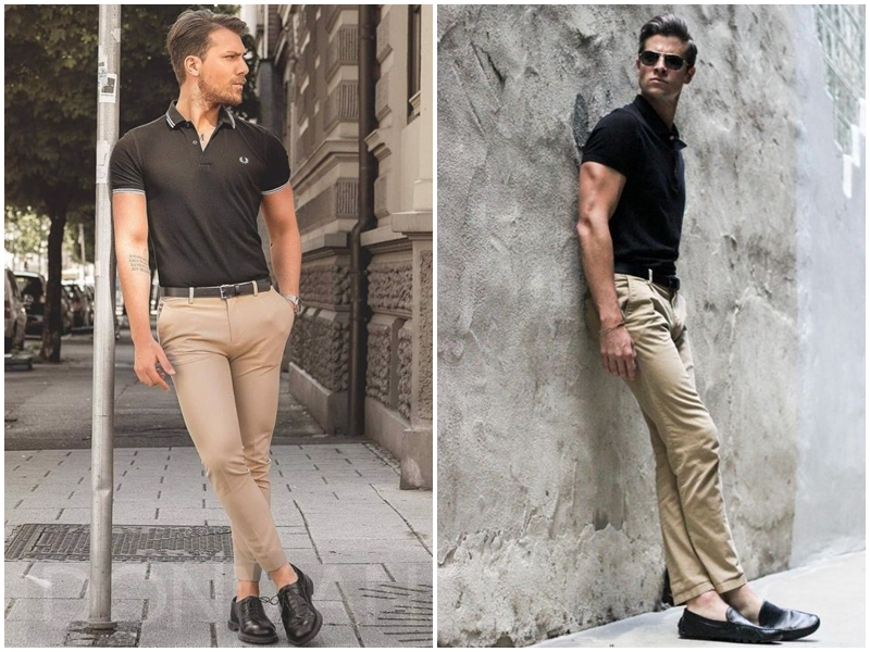 Phối áo polo màu đen nam với quần kaki sáng màu