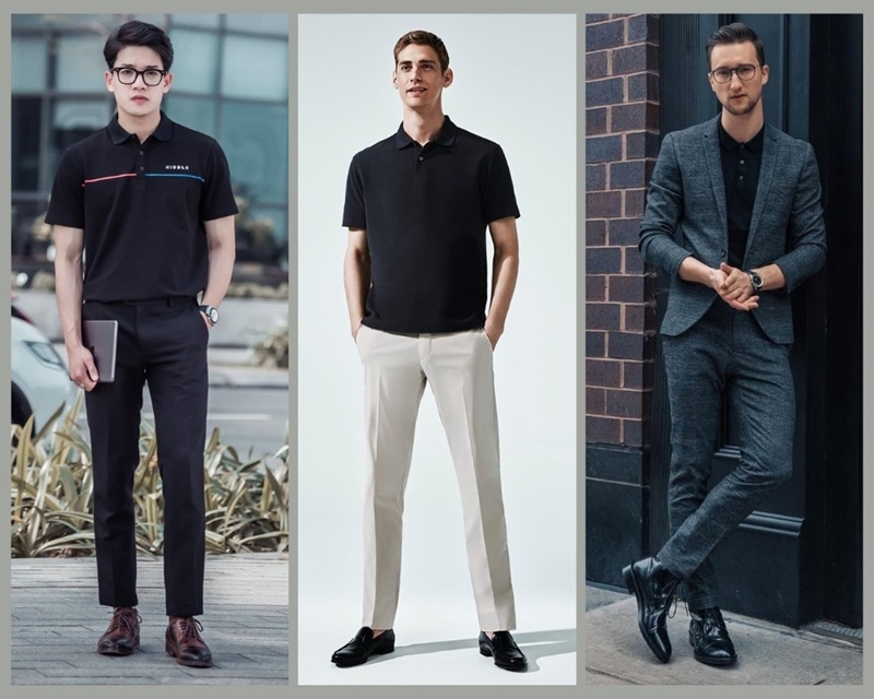 Phối áo polo nam màu đen với quần Tây cùng màu hoặc màu sáng hơn sẽ tạo nên phong cách thời trang thanh lịch và chững chạc cho các chàng trai. Đi kèm 1 đôi giày tây hoặc giày thể thao hay áo khoác Vest/Blazer sẽ tạo nên những style thời trang vô cùng cuốn hút.
