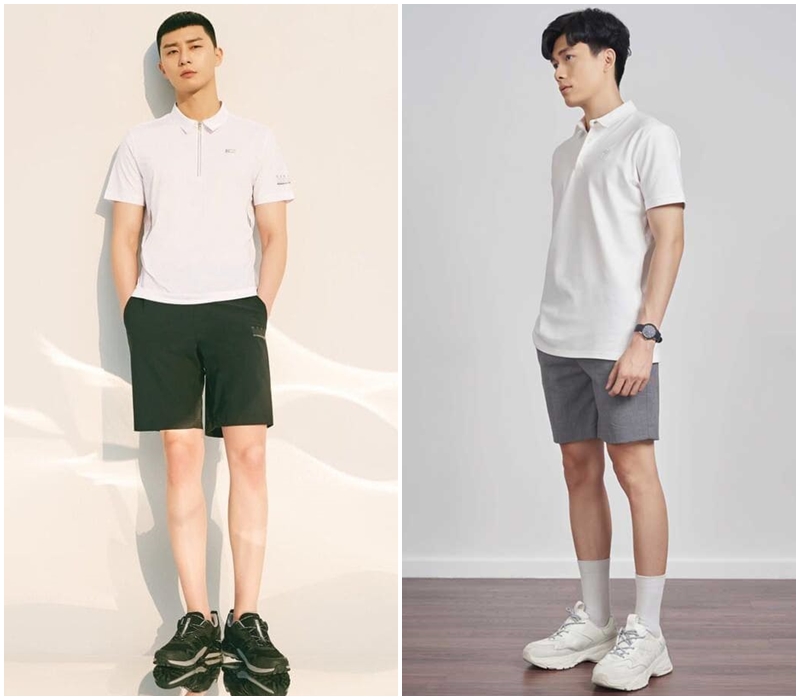 Áo polo nam trắng phối với quần short và giày Sneaker