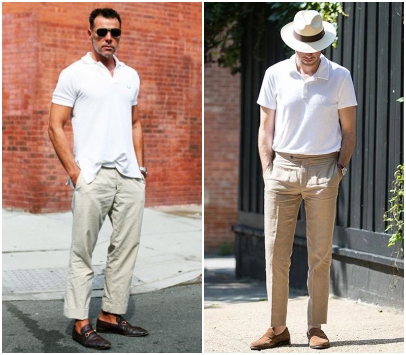 Áo polo nam màu trắng phối với quần Chinos và giày tây