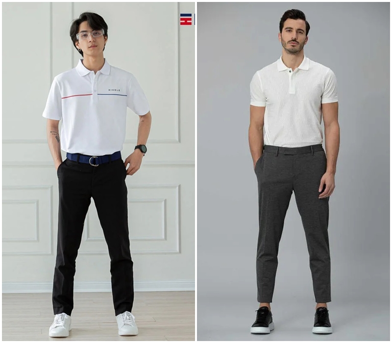 Áo polo nam màu trắng phối với quần Âu/quần Tây