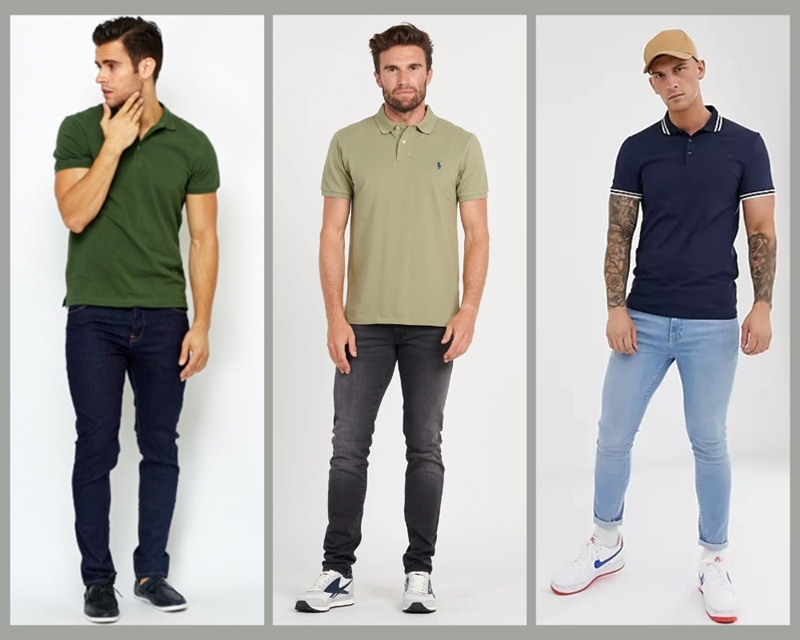 Áo polo nam xanh kết hợp với quần Jean (trắng, xanh hoặc đen)