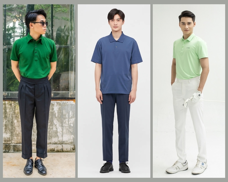 - Áo polo nam màu xanh lá cây nên kết hợp với các gam màu như: đỏ, vàng, đen, trắng, xanh dương, full màu xanh lá cây.