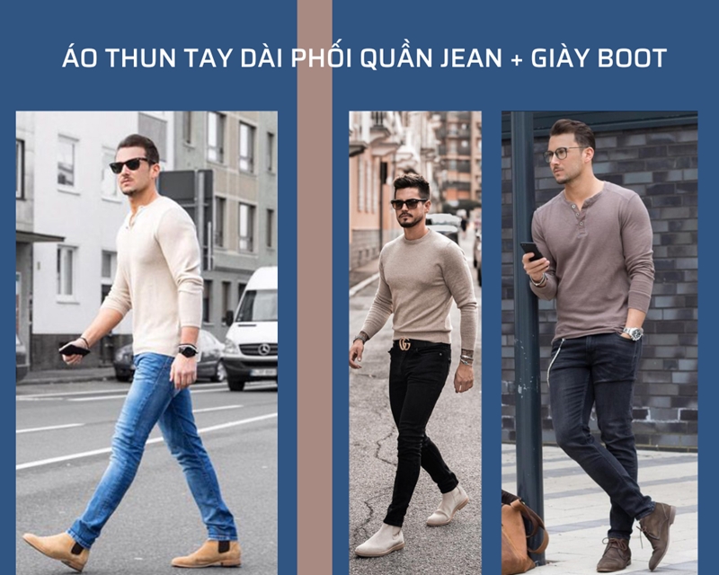 Khi kết hợp quần jeans và một chiếc áo thun nam dài tay sẽ tạo ra một tổng thể outfit đầy sự trẻ và năng động. Nếu phối thêm những phụ kiện đi kèm khác túi xách, giày thể thao, kính mắt sẽ tạo một phong cách thời trang năng động và sang trọng. Gợi ý cách phối chuẩn nhất: Áo thun tay dài nam sáng màu, kết hợp cùng quần jeans, giày Chelsea boot da lộn.
