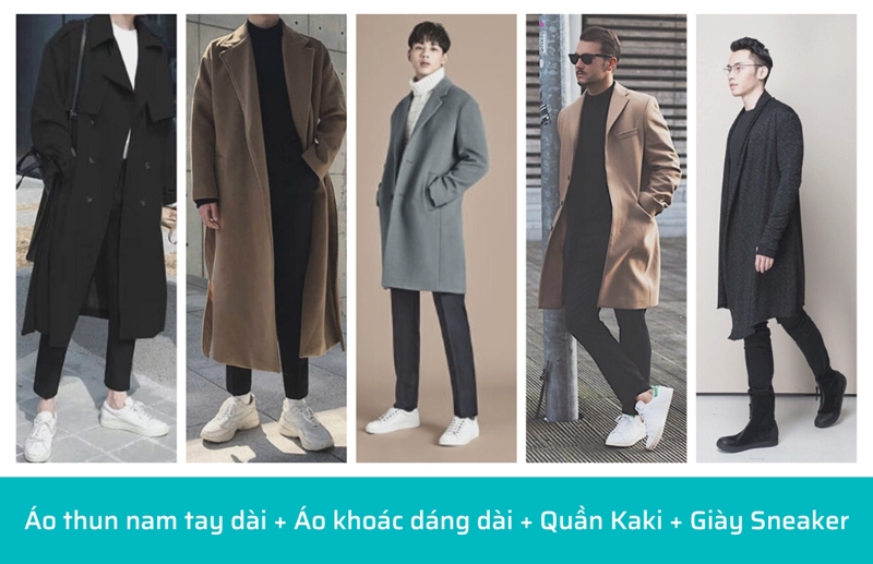 Outfits gợi ý: Áo thun dài tay nam cổ tròn hoặc áo thun dài tay cổ lọ kết hợp với áo khoác dáng dài, quần kaki và đôi giày sneaker. Set đồ này chính là sự lựa chọn tuyệt vời cho những ngày cuối thu, đầu đông và khi diện outfit này tới công sở, đi chơi hay đi hẹn hò đều rất ổn. Với các chàng trai có chiều cao khiêm tốn thì nên chọn những chiếc áo khoác dài trên gối hoặc kết hợp với những chiếc áo có độ dài ngang thắt lưng như áo bomber hay áo da sẽ giúp phong cách thời trang của bạn không bị luộm thuộm mà trông rất cá tính.