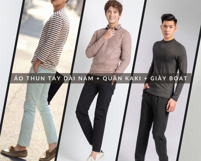 Nếu bạn muốn mang một phong cách thoải mái cho mình thì cũng có thể thay thế chiếc quần jean bằng quần kaki và boat shoes ( giày xuồng ) cho những buổi đi chơi hoặc gặp gỡ bạn bè. Gợi ý cho bạn một Outfits thư sinh: Áo thun nam dài tay màu trắng kết hợp với quần kaki và đôi giày boat.