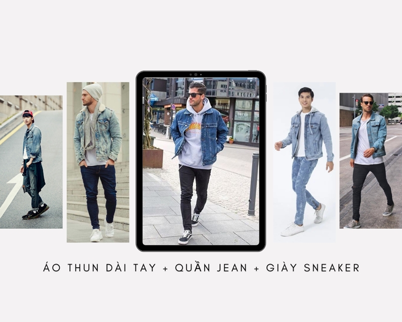 Gợi ý cho bạn Outfits: Áo thun trơn tay dài nam, áo khoác jeans, quần jeans và giày sneaker. Muốn thể hiện phong cách Smart-casual (thông minh và tinh tế) hãy sơ vin áo thun nam tay dài cùng với một chiếc thắt lưng nhỏ sẽ là một set đồ tuyệt vời dành cho bạn. Dù đang sở hữu cho mình một dáng người chuẩn hay không chuẩn thì bộ outfit này vẫn tôn lên được đường nét gọn gàng và có được guu thẩm mỹ cao.