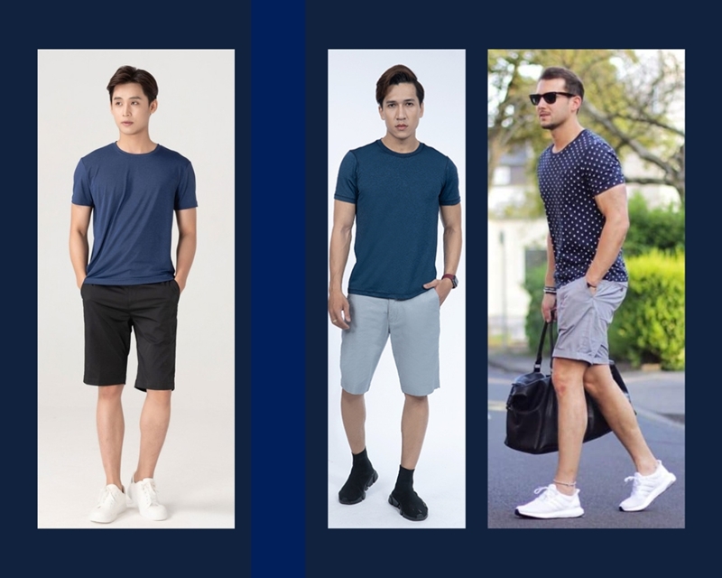 Đây là một sét đồ hoàn hảo để bạn có thể diện khi tham gia những chuyến đi dã ngoại, vui chơi, hay đi du lịch,... Phối áo thun nam cổ tròn màu xanh đen ngắn tay với quần short màu tối như: đen, xanh cùng màu và màu sáng như: trắng, be, kem,... hoặc bạn có thể chọn chiếc áo có phối họa tiết để giúp bạn trông sành điệu và cá tính hơn. Vậy nên các chàng trai nên chọn chiếc áo phù hợp với sở thích và tính cách của mình. Đừng quên kết hợp cho mình thêm một đôi giày sneaker để tăng thêm phần năng động, thoải mái nhất nhé.