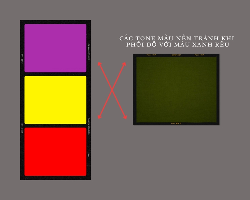 Khi kết hợp giữa gam màu xanh rêu và tím trang phục của bạn sẽ không trở nên hài hòa cho lắm, vì thế nhớ tránh phối hợp hai tông màu này cùng một bộ khi phối đồ nhé.