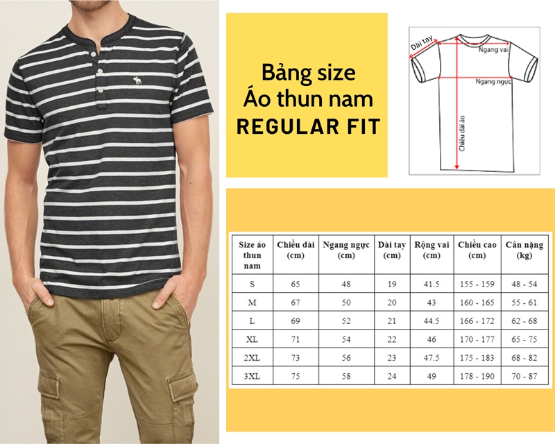 Cụ thể bảng size áo thun nam form Regular Fit như sau: