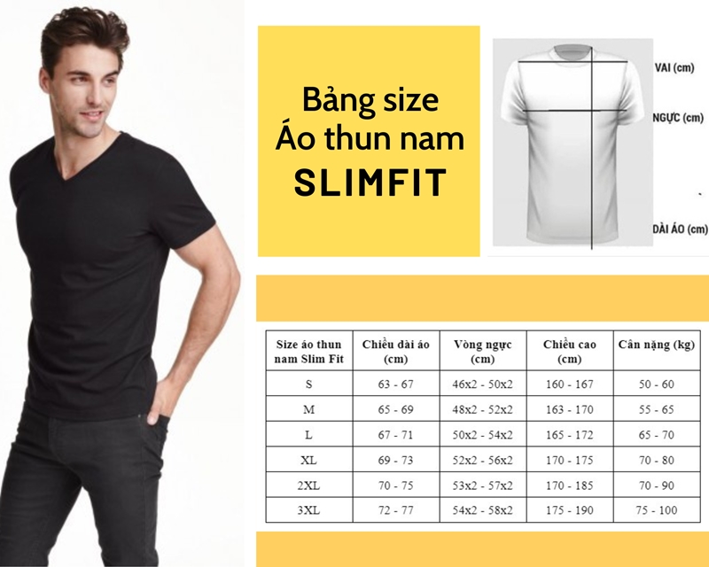 Bảng size áo thun nam form Slim Fit hiện tại đang được quy định theo chuẩn sau: