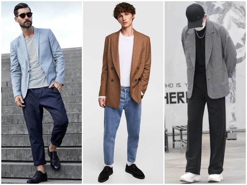 8. Outfit áo thun nam form rộng mix kèm với áo Blazer lịch lãm