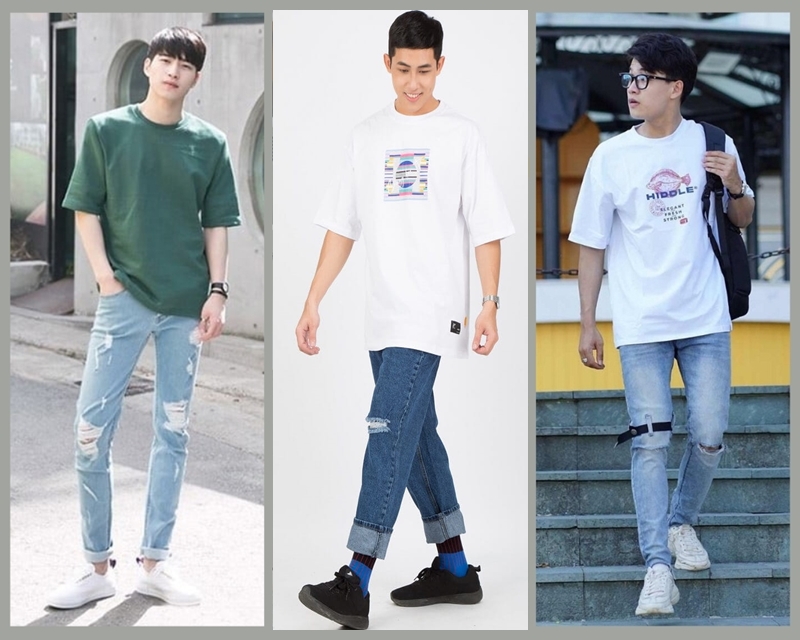Với một chiếc áo thun form rộng có chất liệu cao cấp sẽ giúp bạn phối đồ “chất” hơn nữa. Tuy nhiên, một nguyên tắc khi thực tế áp dụng phong cách này là bạn cần chọn những mẫu quần jean có thiết kế đơn giản và có màu sắc sáng một chút. Áo phông thì nên có ít họa tiết và màu sắc nổi bật hoặc áo thun trơn có màu tương phản với quần. Khéo léo mix thêm đôi giày Sneaker nữa sẽ giúp bạn có một outfit cực “chất chơi” vừa cá tính, vừa thời trang và hiện đại.