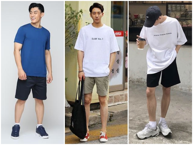 3. Outfit phối áo thun form rộng nam với Quần short Jean, short Kaki, short Caro + Giày Sneaker