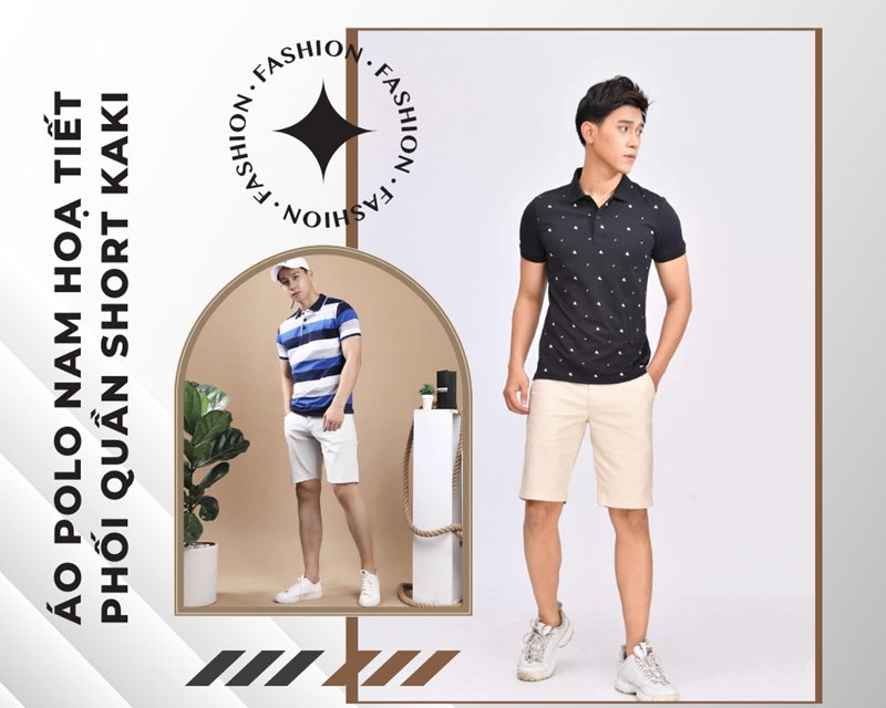 9. Áo polo hoạ tiết nam mix với quần short kaki
