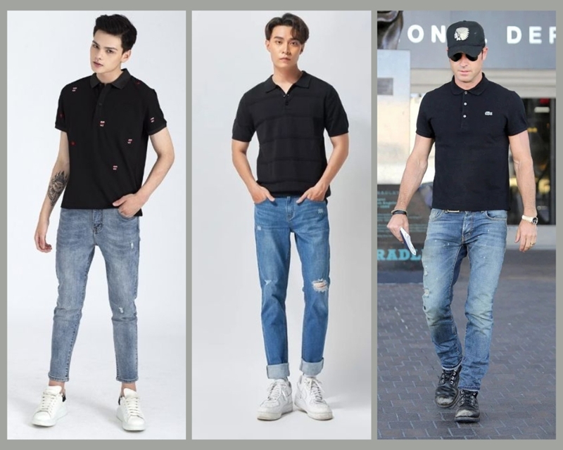 Nếu bạn là chàng trai vừa muốn có vẻ ngoài năng động nhưng không muốn đánh mất đi sự lịch lãm. Rất dễ, chỉ cần kết hợp áo Polo đen với quần Jean màu xanh nhạt là được. Với áo Polo các chàng trai nên cởi hết cúc áo sẽ tạo được điểm nhấn giúp outfit trở nên cuốn hút và lịch lãm hơn trong mắt người đối diện đặc biệt là phái nữ. Với combo này thì các chàng trai có thể kết hợp thêm 1 cặp kính râm hầm hố và 1 đôi giày sneaker màu trắng trông vừa khí chất lại vừa nâng tầm được outfit.