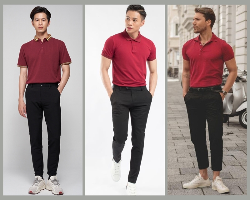 4. Áo polo đỏ mix với Quần màu Đen