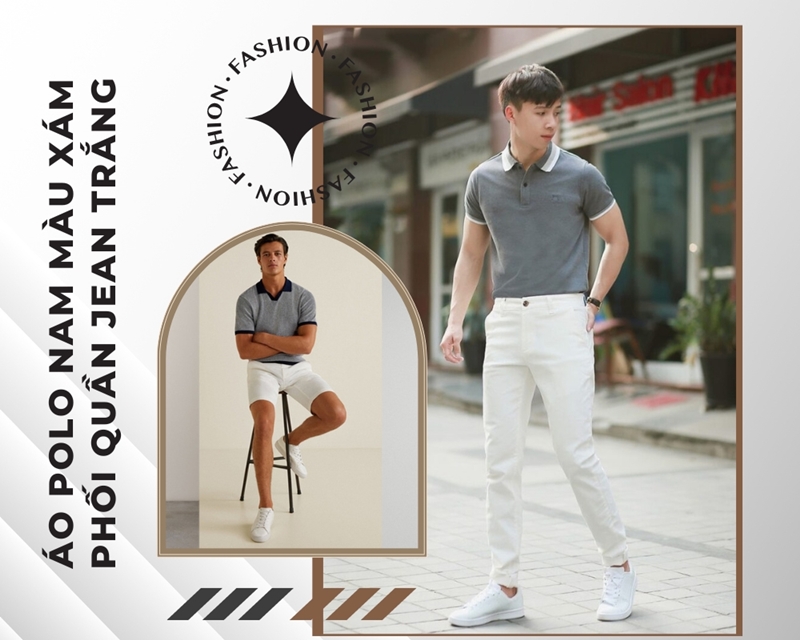 3. Áo polo xám mix với Quần Jean Trắng