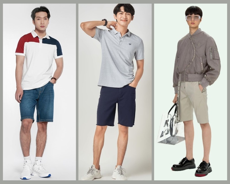 - Cách 3: Một cách phối đồ áo thun có cổ nam tạo hình trẻ trung, năng động khác là mix với quần short, joffer. Cụ thể, bạn diện chiếc áo thun bên trong, có thể khoác thêm một chiếc bomber jacket bên ngoài và phối cùng với chiếc quần short kaki, đi giày thể thao.