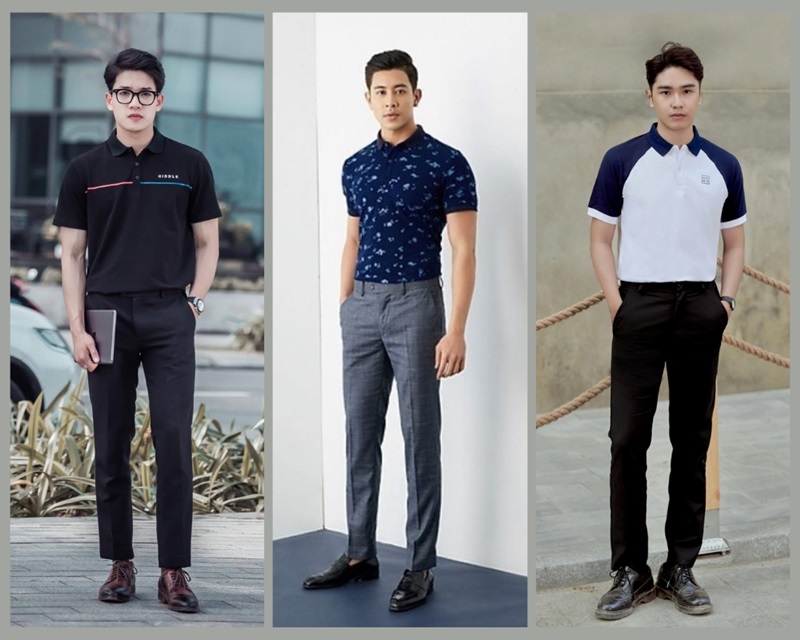 - Cách 4: Các chàng trai có thể diện áo thun có cổ nam với quần Âu tối màu như đen, xám đậm cùng với đôi giày Tây. Chắc chắn sẽ giúp bạn trông rất thanh lịch nhưng vẫn có được sự trẻ trung và đầy năng lượng.