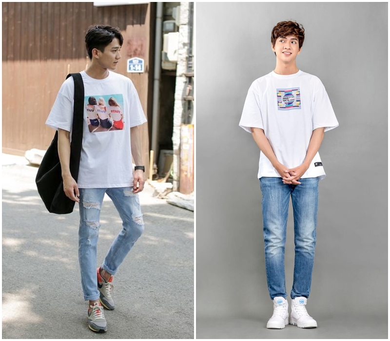 Đây là outfit an toàn và khá phổ biến, rất được nhiều chàng trai diện hằng ngày. Bởi khi mix áo thun tay lỡ nam với quần jean vừa đem lại sự năng động, thoải mái cho người mặc vừa tạo thiện cảm với người đối diện. Bạn nên chọn những chiếc áo có form dáng rộng rãi và đừng ngại thử xắn gấu cho chiếc quần của mình. Sẽ giúp set đồ trở nên phá cách và trông Fashionista hơn hẳn.