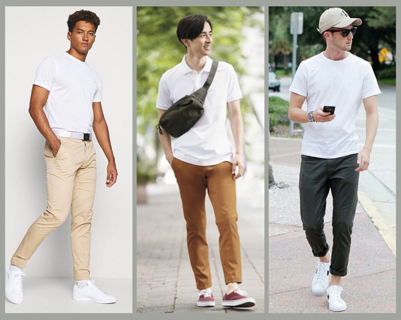 Phối quần kaki với áo thun nam cùng giày thể thao