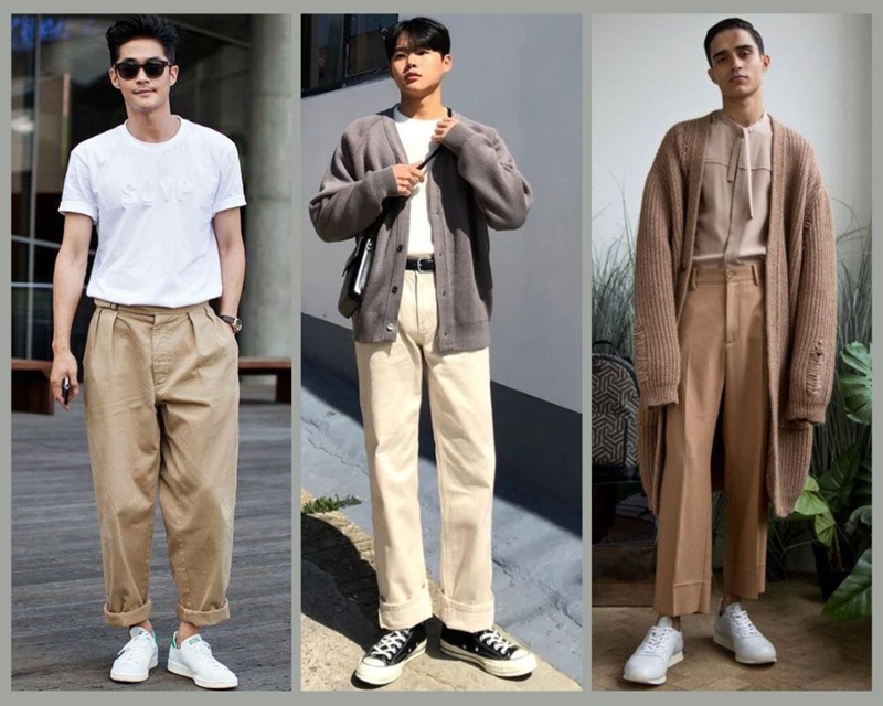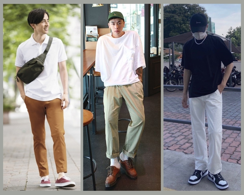 Phối quần kaki ống suông Hàn Quốc với áo thun nam