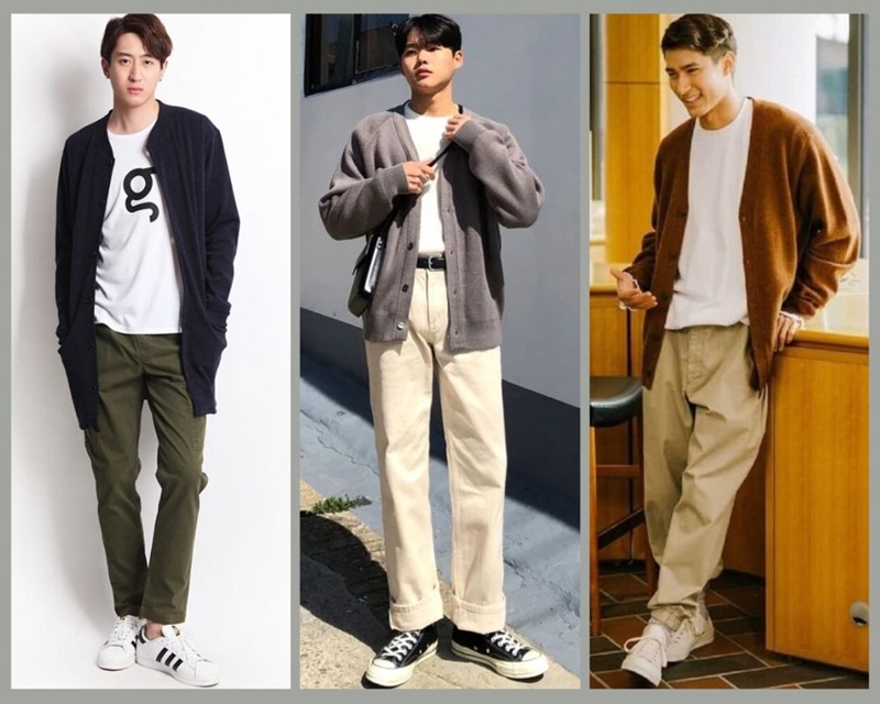 Đối với những chàng trai theo đuổi phong cách sang trọng và nhã nhặn thì cách phối quần kaki với áo thun nam mix cùng áo Cardigan vô cùng hợp lý. Cách phối này bạn hoàn toàn có thể diện vào các dịp khác nhau đều thể hiện được sự thanh lịch và trang nhã.