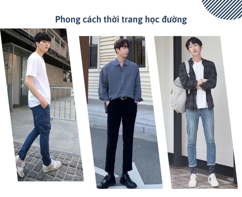 Các chàng trai trẻ hay các bạn học sinh, sinh viên muốn thể hiện phong cách thời trang học được có thể kết hợp: áo phông, quần jean, giày sneaker và một chiếc áo khoác bomber, phong cách học đường mang đến cho người mặc vẻ trẻ trung, năng động và đầy phá cách.