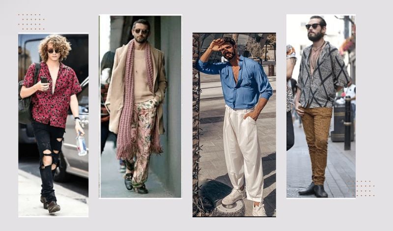 Phong cách thời trang nam Bohemian thường được kết hợp với các phụ kiện như khuyên tai lớn, dây chuyền dài, túi xách mang tay và giày sandal. Phong cách này thường được coi là thể hiện sự tự do, sáng tạo và không ràng buộc.