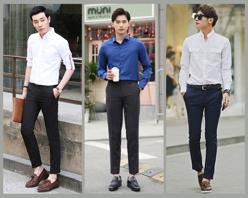 Phong cách thời trang nam Hàn Quốc không thể thiếu outfit quần âu với áo sơ mi và giày lười. Phong cách phối đồ này bạn có thể dễ dàng bắt gặp trong các bộ phim của xứ sở kim chi Nếu bạn là chàng trai sở hữu vóc dáng cao gây với đôi chân thon thì set đồ quần âu áo sơ mi cùng giày lười cực kỳ thích hợp với bạn. Bên cạnh đó, khi lựa chọn phong cách này bạn cũng cần lưu ý việc kết hợp màu sắc với nhau. Do đó, bạn hãy sử dụng áo sơ mi trắng phối hợp với quần tây đen bởi hai gam màu sẽ giúp bạn trẻ trung và thanh lịch hơn.