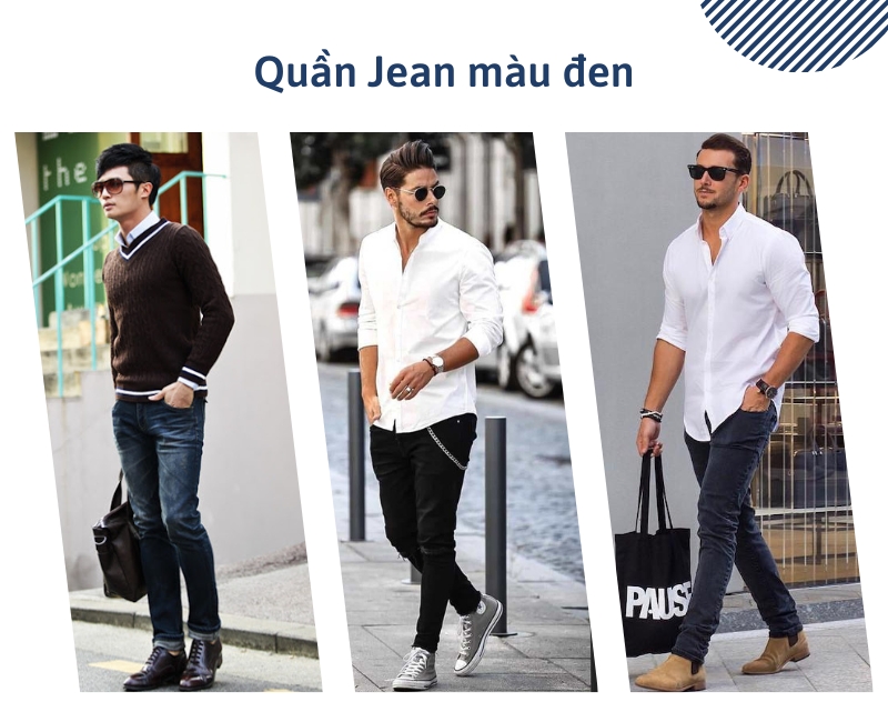 Các chàng có thể chọn cho mình chiếc quần jean đen ống bó, ống côn hoặc ống suông theo sở thích cá nhân của mình. Quần jean đen ống vừa vặn, họa tiết tối giản hay không có họa tiết sẽ là lựa chọn tuyệt vời cho nam giới làm việc nơi công sở. Loại quần jean này nam giới có thể kết hợp với áo sơ mi hay phối áo khoác blazer bên ngoài để có thể diện đi làm.