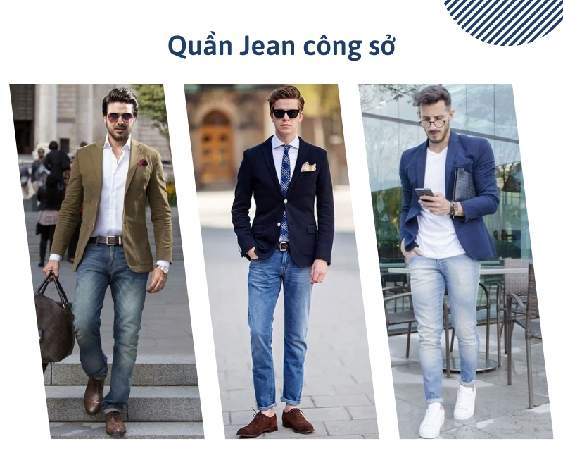 Trong công việc kinh doanh, nam giới có thể kết hợp quần jean công sở với áo sơ mi và áo khoác blazer. Áo khoác blazer sẽ giúp tăng thêm vẻ lịch sự và chuyên nghiệp. Nếu muốn thêm phần năng động, bạn có thể chọn giày sneaker hoặc giày loafer.