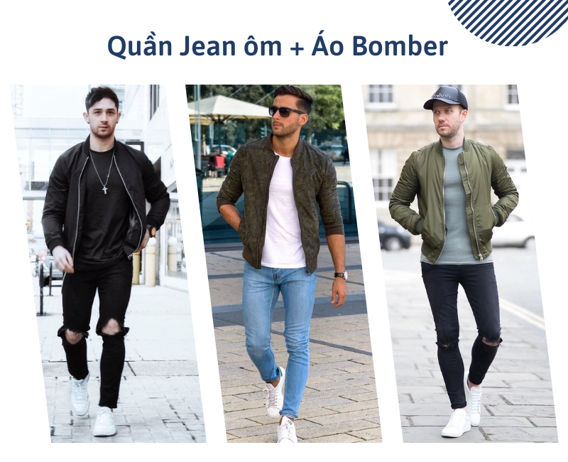 Khi kết hợp với quần jean nam ôm body với các kiểu áo khoác bomber giúp nam giới tạo ra phong cách bụi bặm và năng động. Loại áo này cũng giúp tạo ra sự cân bằng về tỉ lệ cơ thể và tôn lên vẻ nam tính, sành điệu cho các chàng trai.