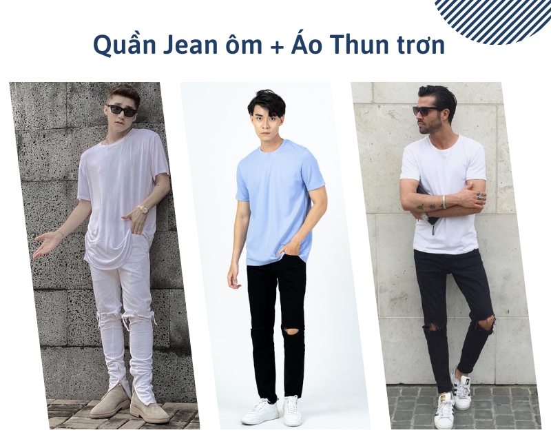 Quần jean nam ôm rách gối phối với áo thun trơn