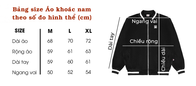 Áo khoác nam châu Á size M: cân nặng từ 54kg – 60Kg, chiều cao từ 168cm – 174cm.