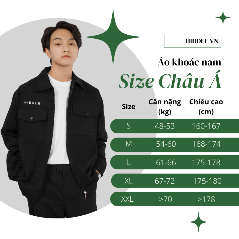 Áo khoác nam châu Á size XXL: cân nặng trên 70kg, chiều cao trên 178cm.